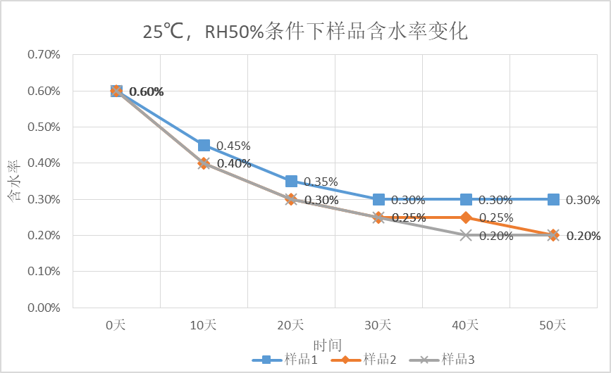 按以上尺寸,分别制作10个包装袋,每个包装袋内加入5.0g±0.1g药品。分别取样品1,2,3的5个样品置于25℃,RH50%、和25℃,RH90%两个不同条件下的恒温恒湿箱内保存。在第10天,第20天,第30天,第40天,第50天时两种不同条件下储存的3种样品经过测试的含水率如下: